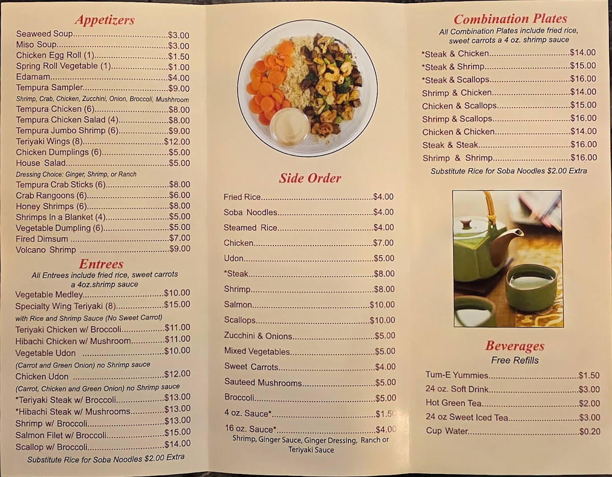 Entrees include a range of protein and vegetable-based dishes such as Teriyaki Chicken with Broccoli, Hibachi Steak with Mushrooms, and Vegetable Udon. These items provide options suitable for those seeking a hot meal with classic Japanese flavors.