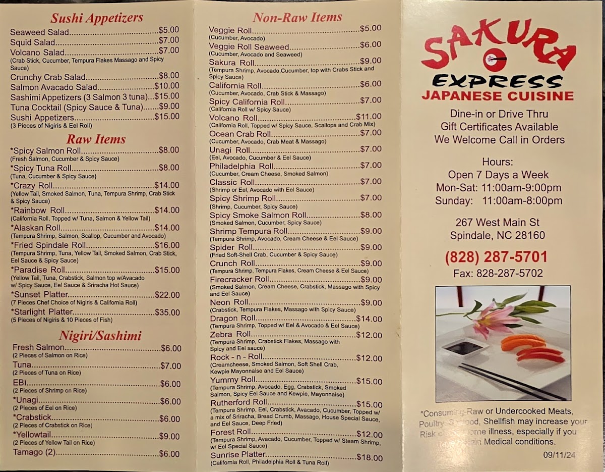 The menu offers a variety of Japanese cuisine items, structured to cater to different preferences and meal occasions. It features a selection of entrees, nigiri and sashimi, and raw sushi rolls, allowing for quick orders or casual dining.