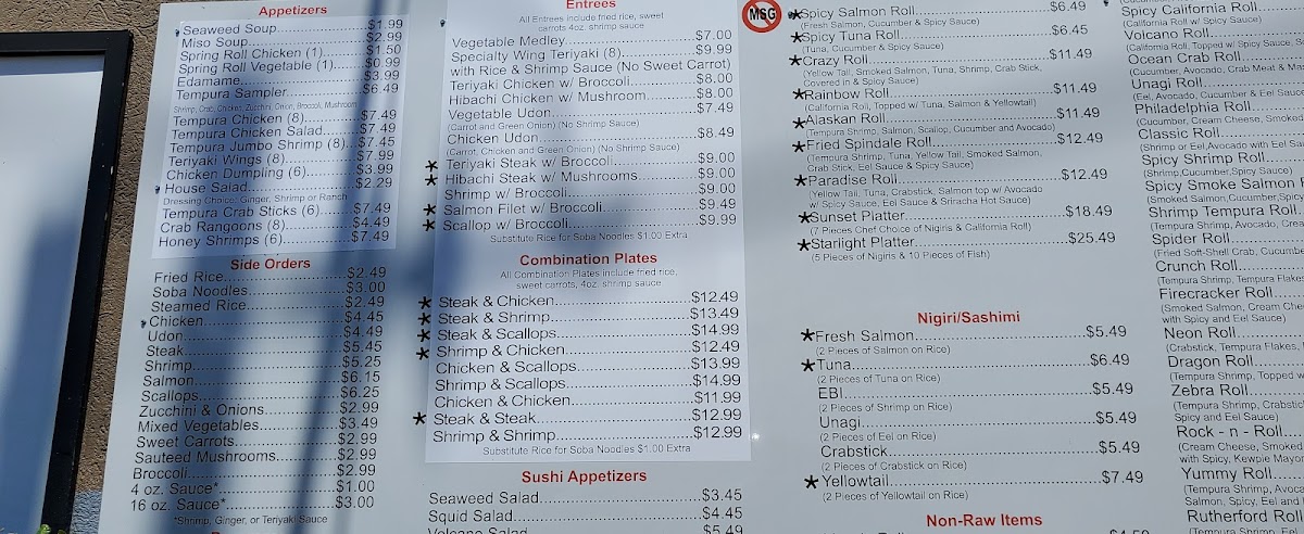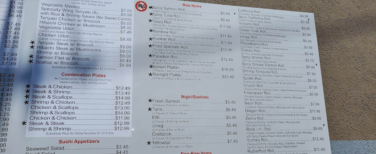 Raw Items consist of various sushi rolls, with selections such as Spicy Salmon Roll, Spicy Tuna Roll, Crazy Roll, Rainbow Roll, and specialty plats like the Starlight Platter. These options generally consist of assorted ingredients rolled in seaweed and rice, suitable for those interested in diverse sushi choices.